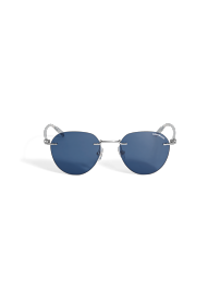这款无框太阳镜配备银色金属镜框和蓝色镜片,镜腿内部饰以万宝龙六角白星品牌标识,左侧镜片以激光雕刻万宝龙品牌标识。
