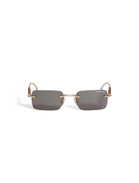 这款无框方形太阳镜配备金色金属镜框和灰色镜片。管状镜腿点缀万宝龙六角白星品牌标识,饰有木质元素。左侧镜片以激光雕刻万宝龙品牌标识。
