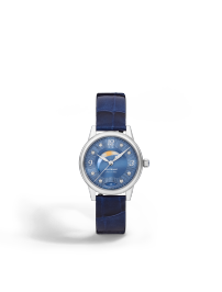 万宝龙宝曦系列昼夜显示腕表以优雅而柔美的方式诠释高级制表规则,设计灵感源自书写和水彩世界,搭配30毫米精钢表壳。优雅的蓝灰色表盘饰有钻石时标、镀铑花体阿拉伯数字和指针。采用星际(“filé d’étoiles”)冲压工艺。搭载MB 24.20型自动上链机芯,设有时、分、秒显示,杏仁形视窗中显示日期,饰以手写字体日期。表盘以手写字体呈现“Jour et Nuit”(日与夜)字样。水彩效果的昼夜显示表盘,赋予在24小时内昼夜变幻的诗意效果。配备可更换鳄鱼纹印花蓝色小牛皮表带,另附赠一条表带。