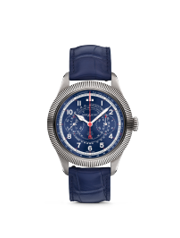 - 蓝色表盘,搭配白色夜光镀铑阿拉伯数字和时标;测速和测距刻度
