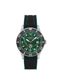 - 绿色冰川图案表盘,搭配白色夜光镀钌阿拉伯数字和时标