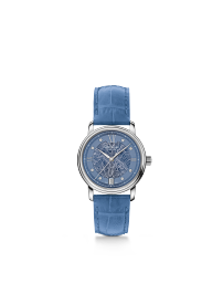 - 蓝色表盘勾勒勃朗峰地形,搭配银色罗马数字和钻石时标