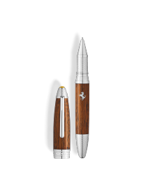 此次万宝龙和法拉利的联名围绕三个系列开展:Classica、Inedita和Scuderia。法拉利顾客可以从这些系列的一个或多个中获取灵感,并根据自己的喜好调整各种元素。 这支签字笔设计灵感源自Classica系列,它为Maranello的标志性GT赛车的设计风格与特色增添了现代气息。此书写工具基于这些特点,旨在向250 GTO方向盘的设计致敬,亦展现了把握方向盘的感觉和梦想。笔帽顶部饰有黄色树脂万宝龙六角白星品牌标识,致敬法拉利配色,铂金涂层笔帽顶部和镀铂金笔杆尾端镌刻图案,令人联想到方向盘辐条上的精美纹路;这一细节同样装饰在笔杆前端。笔帽和笔杆均采用沙比利木制成,饰有优雅的黑色漆面嵌件和法拉利腾跃马贴标。
